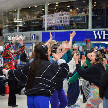 A crowd of people at a Waterloo Station silent disco