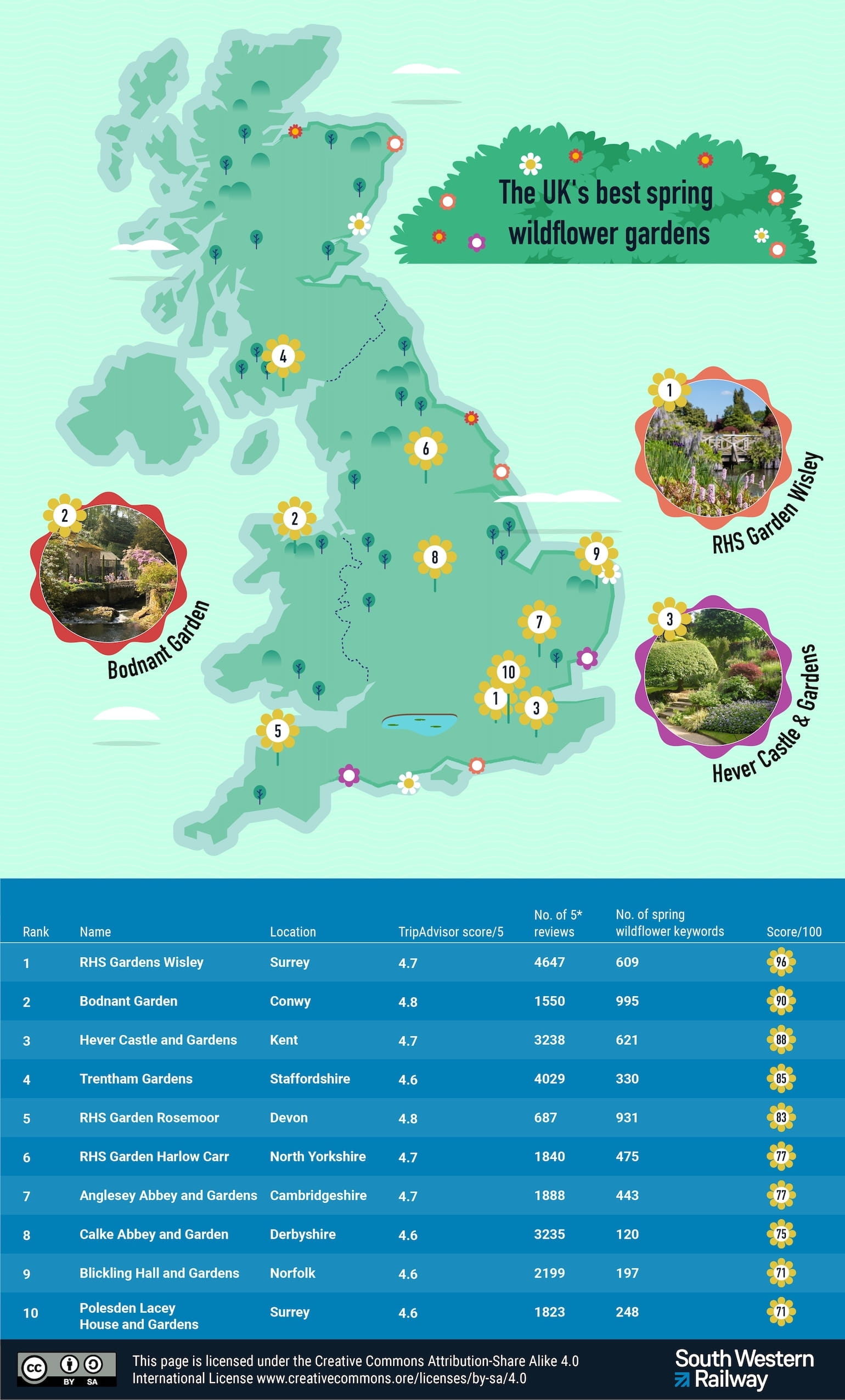 To find the best gardens to visit in spring, SWR generated a score out of 100, the ‘Wildflower Experience Score’, for each garden based on Google Review metrics: